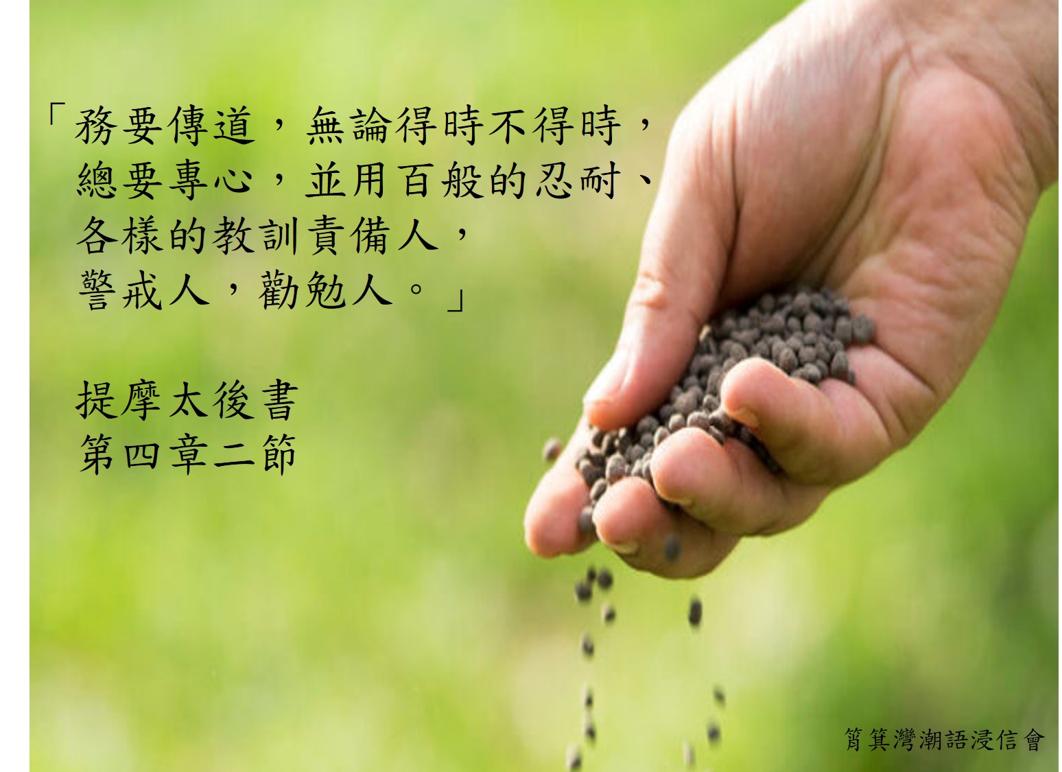 「務要傳道,無論得時不得時,總要專心,並用百般的忍耐、各樣的教訓責備人,警戒人,勸勉人。」