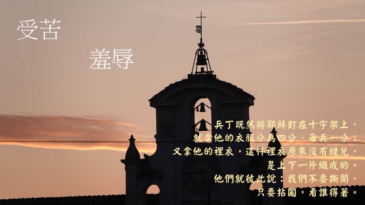 從被彼拉多審判到被釘十架上,耶穌基督受盡了外在和內在,有型和無型的羞辱,為的就是我們這群充滿軟弱,被罪捆綁的罪人。但祂在被羞辱當中,祂仍然顧念著祂所愛的人:我們從耶穌在十架上將經歷著同樣傷痛的母親,將她交托給自己所愛的門徒,從耶穌這樣的舉動,我們就更看到祂是如何愛祂所愛的人,去愛到底。今天,我們其實嘗受著耶穌這份大愛給我們帶來的救贖,我們是否能夠同樣的愛耶穌,願意為祂受苦,甚至因著信仰而被羞辱?