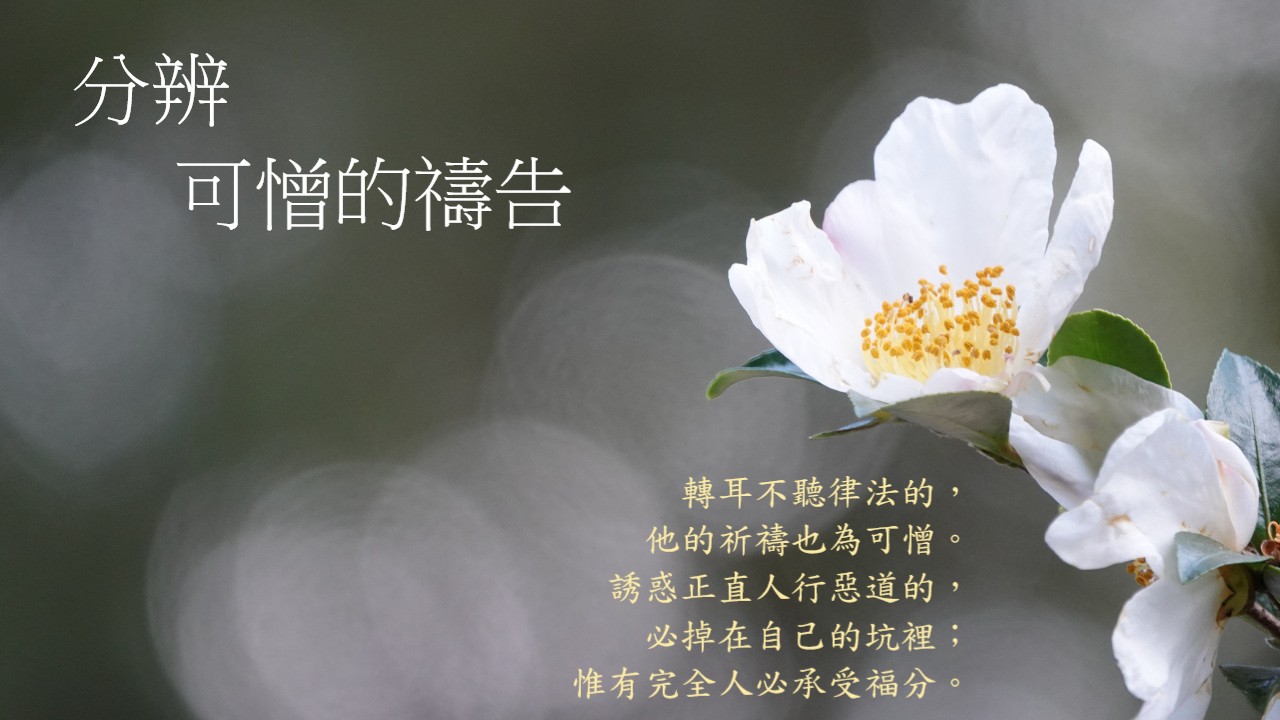 今天,其實我們都在這混亂的世代中,經歷著不同的艱難,甚至是缺乏。但正如昨天我們讀約伯記時讀到以利戶「正確」的教導,就是神會使用「困苦」來拯救人離開「困苦」,所以我們實在要好好活在這些艱難缺乏中,然後以「正確」的禱告,使我們能經歷神真實的,在靈裏的豐富。但若然有一天,我們進入了「平安」,甚至是「富足」時,今天智者的教導,又對我們帶來甚麼提醒?我們會否因著不正確的心,而作出「可憎的祈禱」?