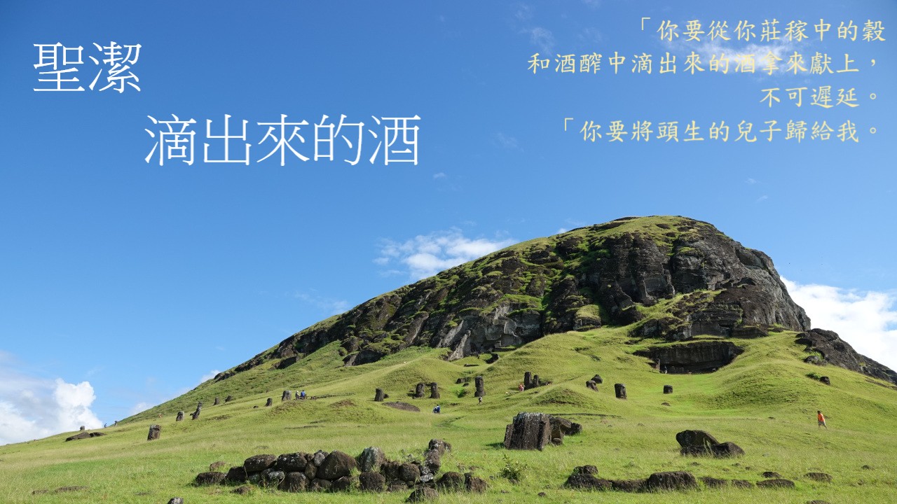 說了這麼多,就是因為今天我們讀的經文中,就出現了一句「滴出來的酒」,而這又與「頭生」的放在一起,成為要獻給耶和華的祭物。這「滴出來的酒」,應該對聖經時代的人,就會十分明白;但對我們來說,就需要上面的資料,讓我們可以多一點理解。現在就讓我們來看,記載在出埃及記,摩西所領受,耶和華要以色列人遵行的「律例典章」的其中一部份。