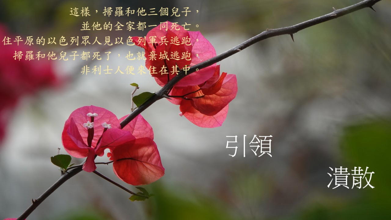 歷代志敘事的開始,是一場戰役,是叫以色列人「沒齒難亡」,就是他們與他們的「死敵」非利士人的爭戰。然而,當大部份人所記得,所傳頌,與非利士人的戰爭,是掃羅作王時,大衛因打死巨人歌利亞而將戰況逆轉,將入侵他們國土的異族人趕走,歷代志一開始記載的,卻是掃羅戰死沙場的一幕。而且,不單是掃羅王在此次戰役中身亡,就是連他的兒子們,也全死於非利士人的手中。10:6,作者更要刻意地提到「他的全家都一同死亡」。雖然,領軍的戰死沙場,是一件叫人感到悲傷的事,但其實這也算是在戰場上自然會發生的事。然而,作者在這裏仔細地說出掃羅在自知「大勢已去」時,作出「自殺」的決定,就讓讀者看見他們的領袖,是看重自己的「榮耀」,遠過於他作為被耶和華膏立的王,所應該要持守神的僕人之身份。當他作為受膏者的屬靈身份,因著自我而開始潰散,今天我們讀的這段經文,最後的第7節,就叫我們看見這潰散就延伸至以色列整個大軍,最後甚至令整個以色列民族也開始潰散了。