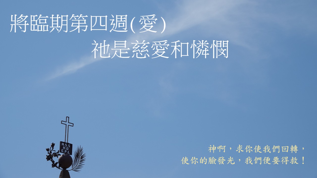 今天,我們仍活在一個敗壞了的世界,活在一個惡人當道的世代中,我們也因著軟弱,會有得罪神的時間。所以,我們就一直經歷著不同的艱難,甚至是災難的處境。我們是否認清,神已藉著耶穌基督道成肉身的降臨,當我們還作罪人的時候為我們死,來顯明祂對我們的愛?當昨天在將臨期的第四主日中,點燃第四枝代表著神的愛的「愛之燭光」時,我們是否完全相信神是愛我們,引領我們的好牧人?而當將臨期花環外圍的四枝燭光都已點燃,我們又是否滿有信心,基督的光將會很快臨到,要完全照亮這黑暗世代,叫我們一直等候的終末拯救,在我們經歷了耐心等候後,最終要臨在我們中間?